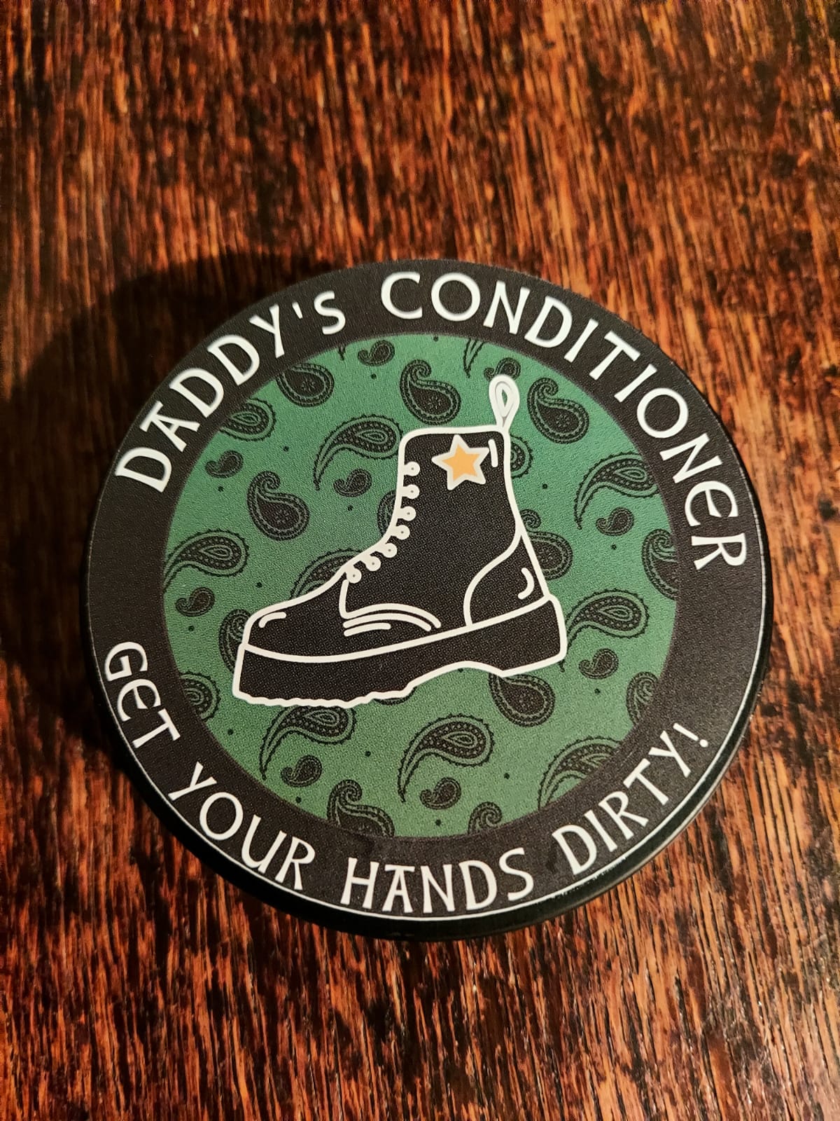 Flagging Hunter Green is Daddy’s Conditioner: a light, soft cream conditioner for all your leather needs. Enriched with luxurious cocoa butter and lemon oil, perfect for lighter garment leather, full grain, chrome tan, and soft leather boots. Gently nurturing, just like Daddy! Warm it on your hands and rub it in. It leaves your leather smelling like white chocolate and lemon cheesecake. No seriously…. It does!